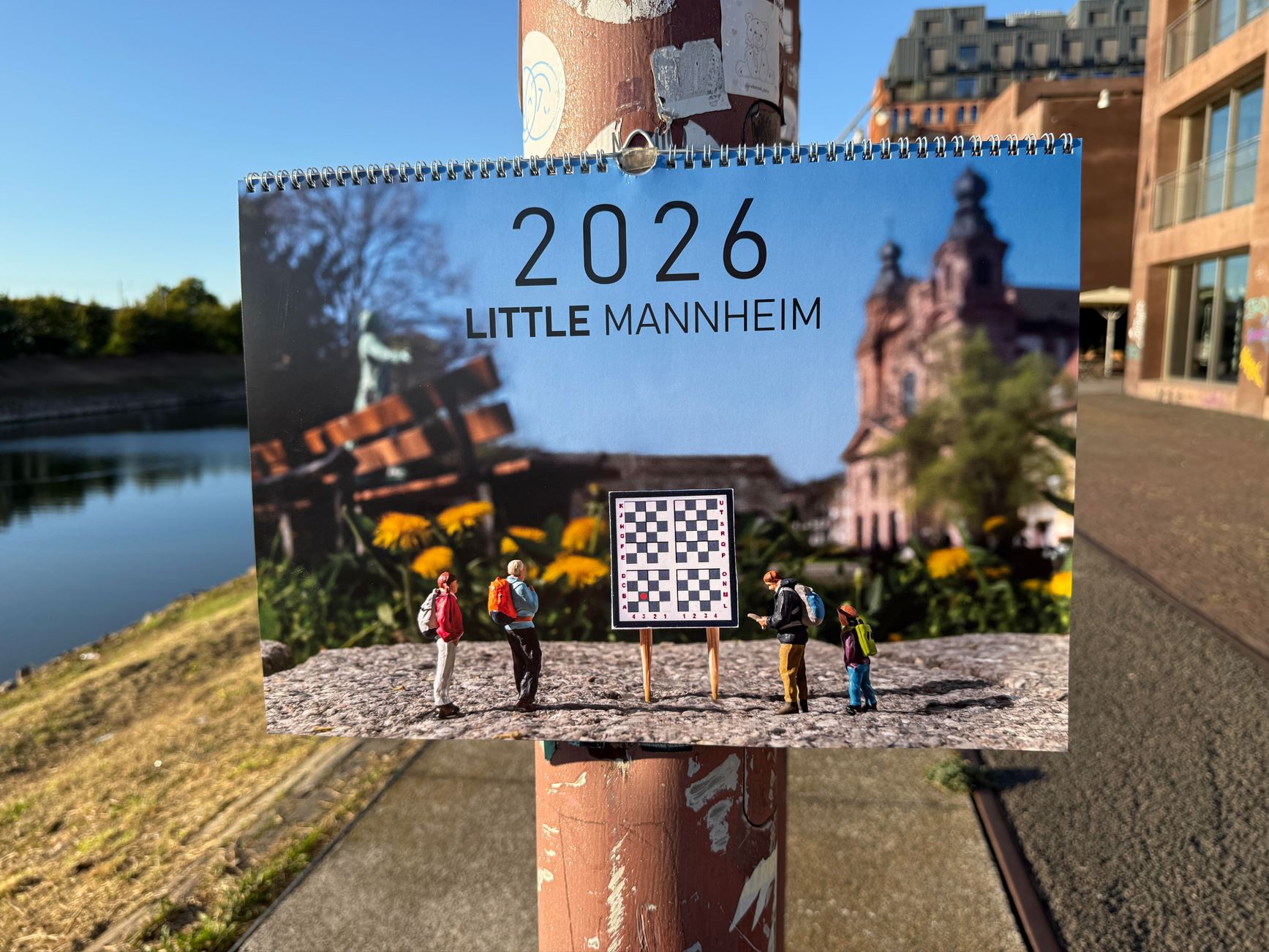 Der Little Mannheim Kalender für das Jahr 2026 beinhaltet kreative Miniaturszenen des Fotokünstlers Benedikt Hild, welche die pulsierende Quadratestadt aus der Perspektive von winzigen Figuren darstellt und ist in zahlreichen Mannheimer Buchhandlungen erhältlich.